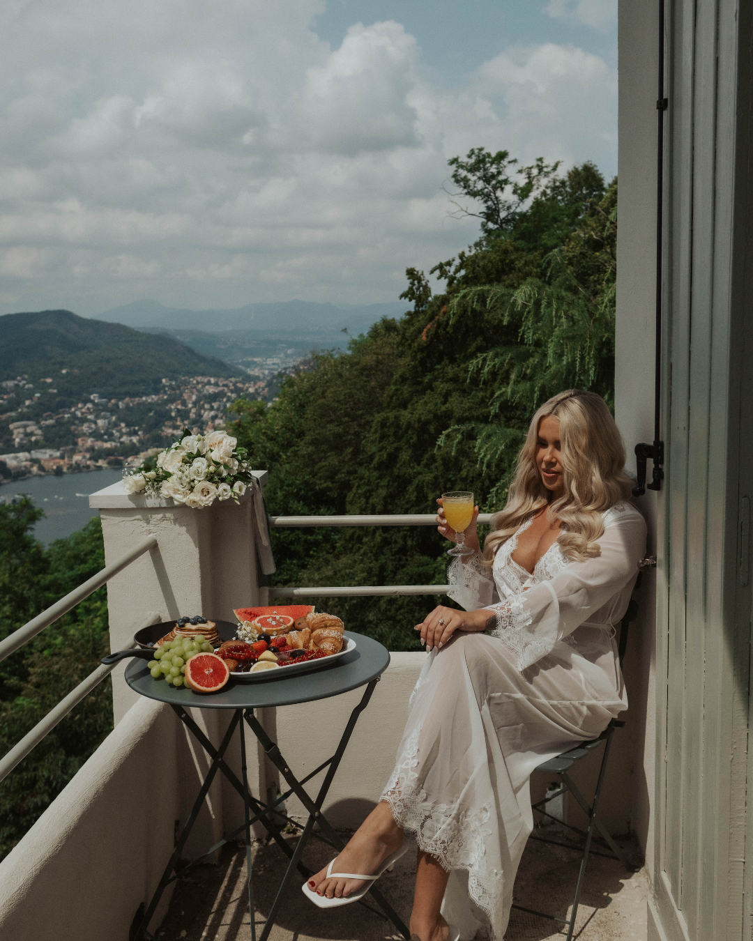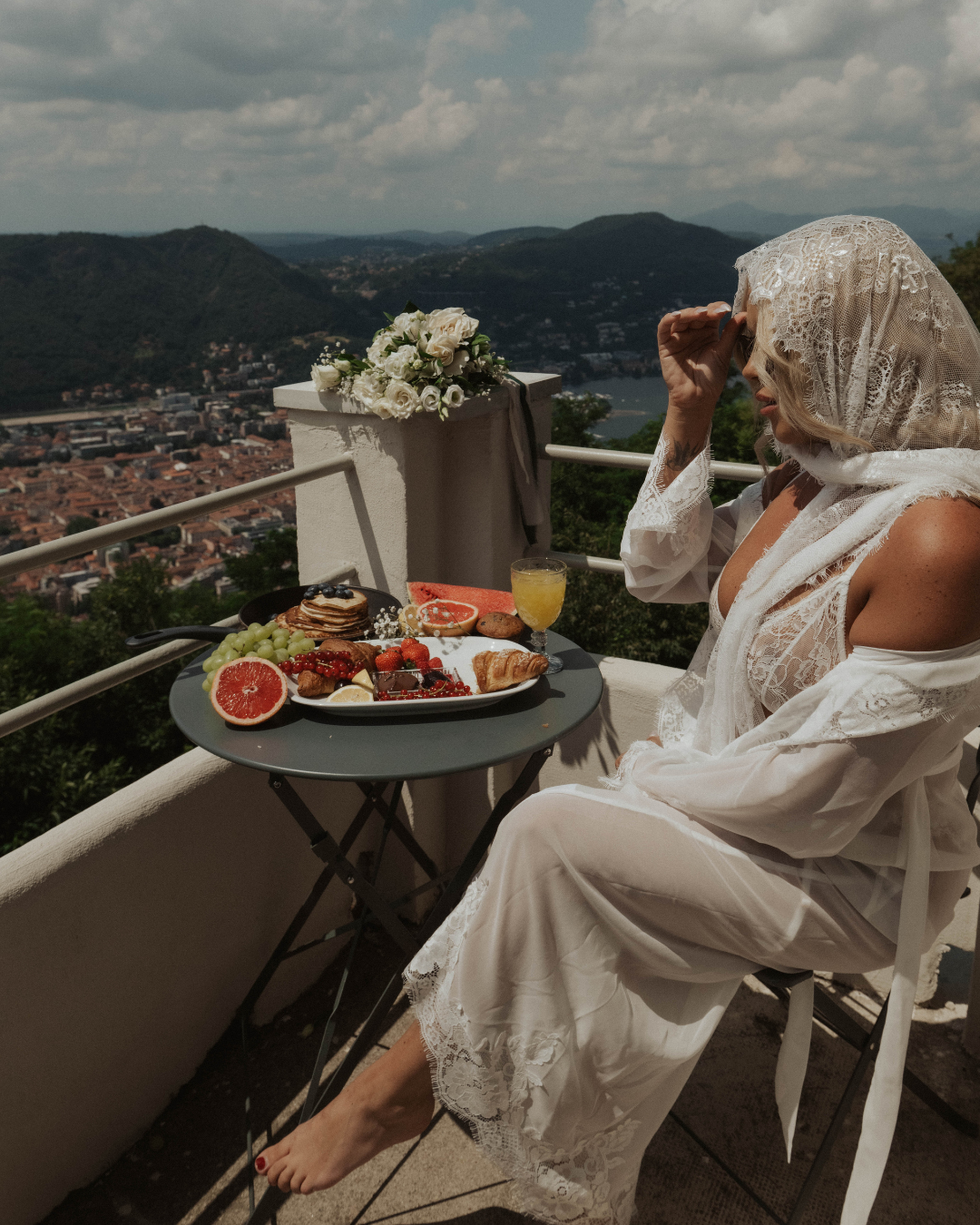 The pieces felt so romantic and perfect for Lake Como Italy. I wore the Helena Lace robe with the Sydney Bra, GString and matching Suspender underneath!