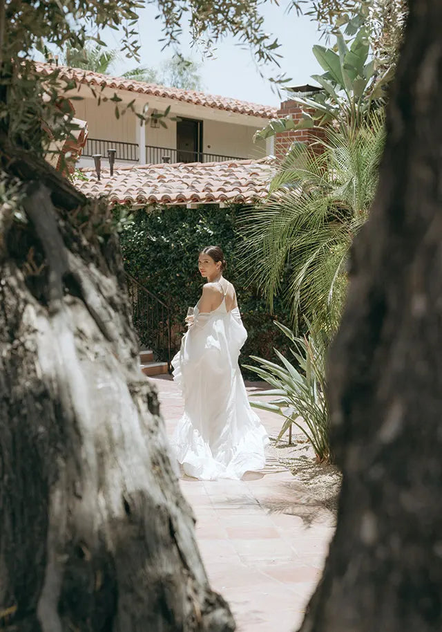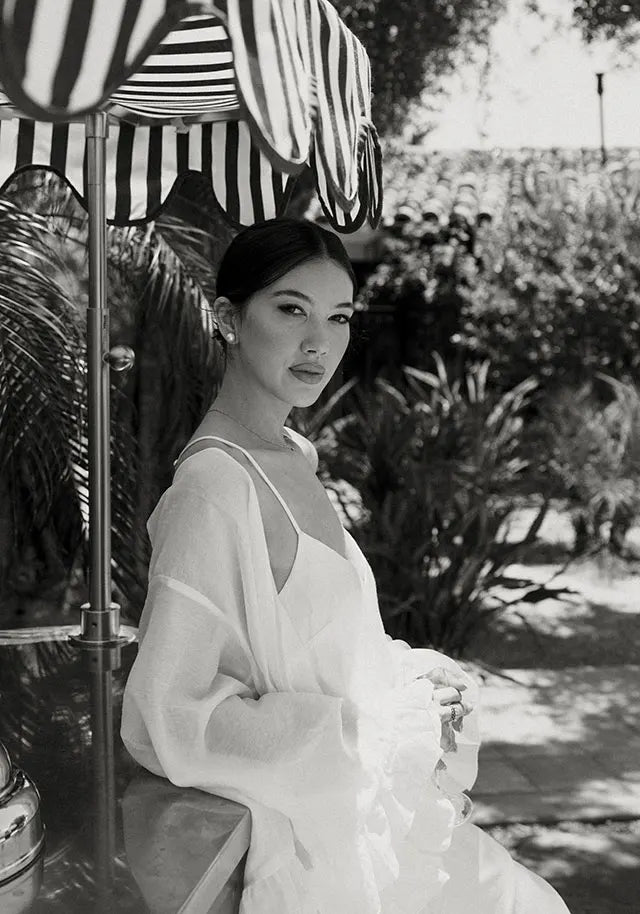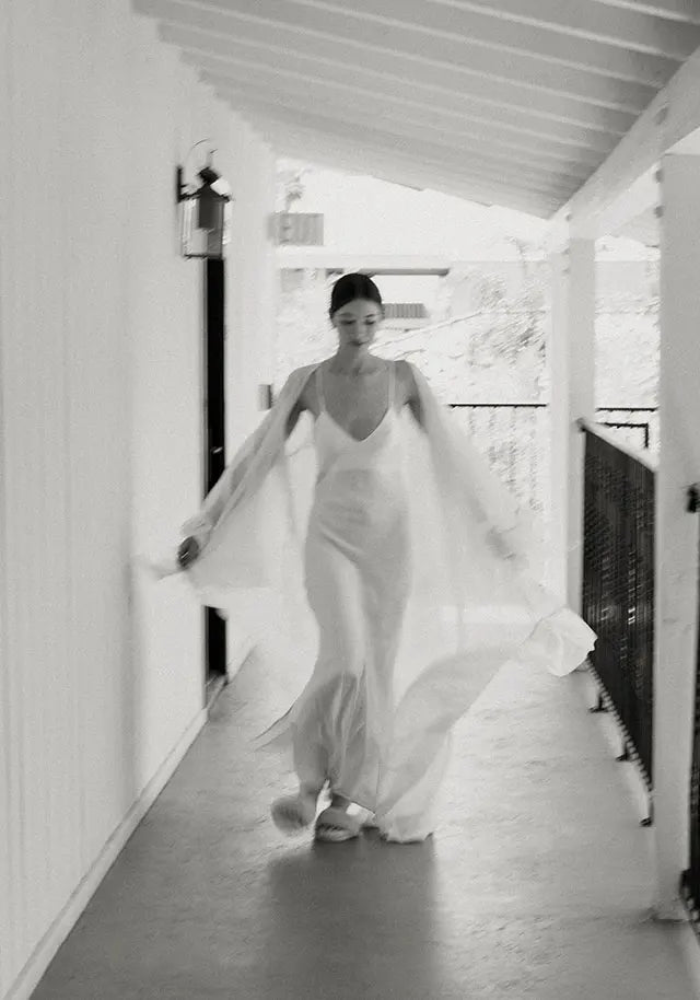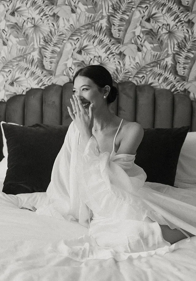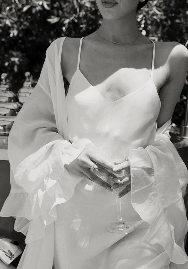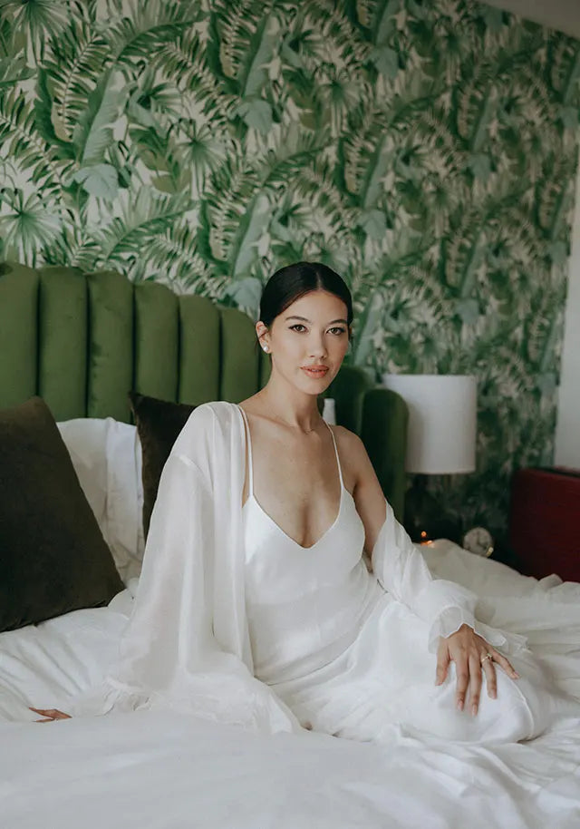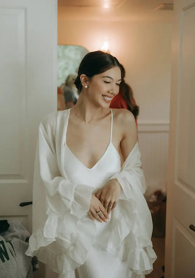 Style note: To get ready for her beautiful Palm Springs wedding, bride Natalie wore Homebodii’s Gaylene Linen Robe in white and Kiralee Luxury Satin Slip Dress also in white.