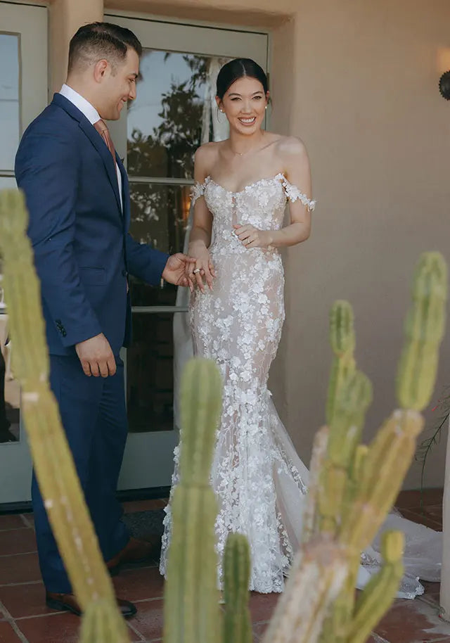 “Jasper gave me full control of planning the wedding, his role was to be in the charge of the music. This was something I obviously had been planning and dreaming about doing since I knew what weddings were. I wanted to find a venue where I didn’t have to do much to make it special and had beautiful scenery and landscaping. I had seen the venue we chose on Pinterest a few years back and once we found an [available] date in 2022, we booked it without even seeing it in person. We got married at the O’Donnell House in Palm Springs, California and it was a dream.”