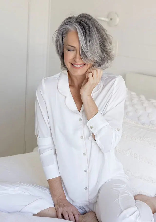 Our Eva range is another supremely soft, feminine, fashion-forward, earth-friendly option. Crafted from breathable, smooth, comfy TENCEL™ you and the planet will sleep well in this sleepwear. For the warmer months we suggest adding our Eva matching short pjs set in blush with white piping to your sleepwear line-up. This charming matching set is elegant, feminine and thanks to the fabrication, exceptionally easy-breezy to wear.