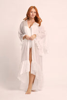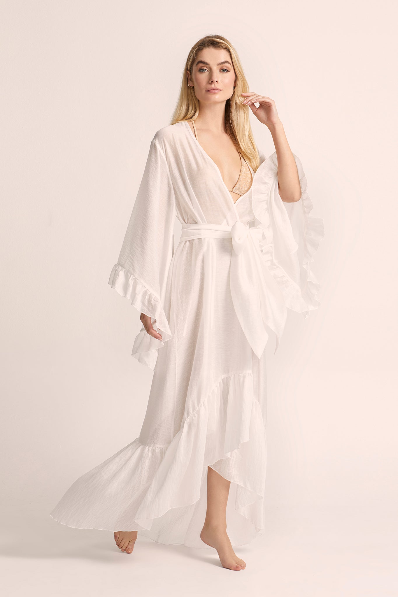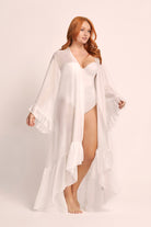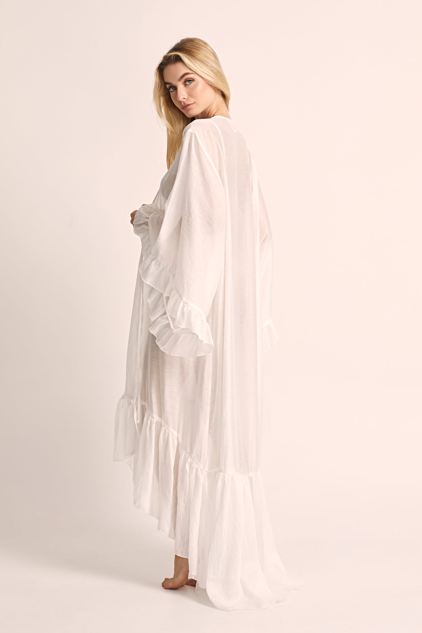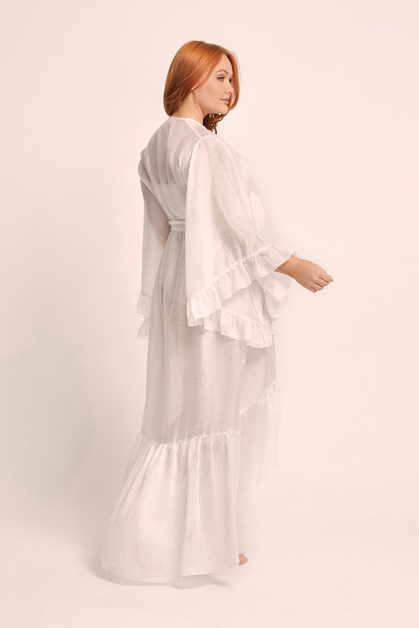 For the days when you crave an airy, flirty touch, Homebodii's 'Gaylene' robe is your ideal choice. Its charming accentuated ruffles and graceful flow create a distinctive and stylish look, whether you're lounging by the pool, strolling along the beach, or if you're a discerning bride seeking a statement piece for your big day and beyond.