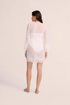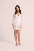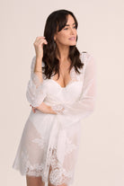 Enhance your elegance with our adored Helena lace robe. Meticulously crafted from semi-sheer white chiffon and embellished with intricate lace rosettes, this exquisite piece strikes the perfect balance between allure and refinement. Whether you're getting ready for a significant occasion or simply desiring a touch of sophistication, the Helena robe is the ultimate addition to your wardrobe.
