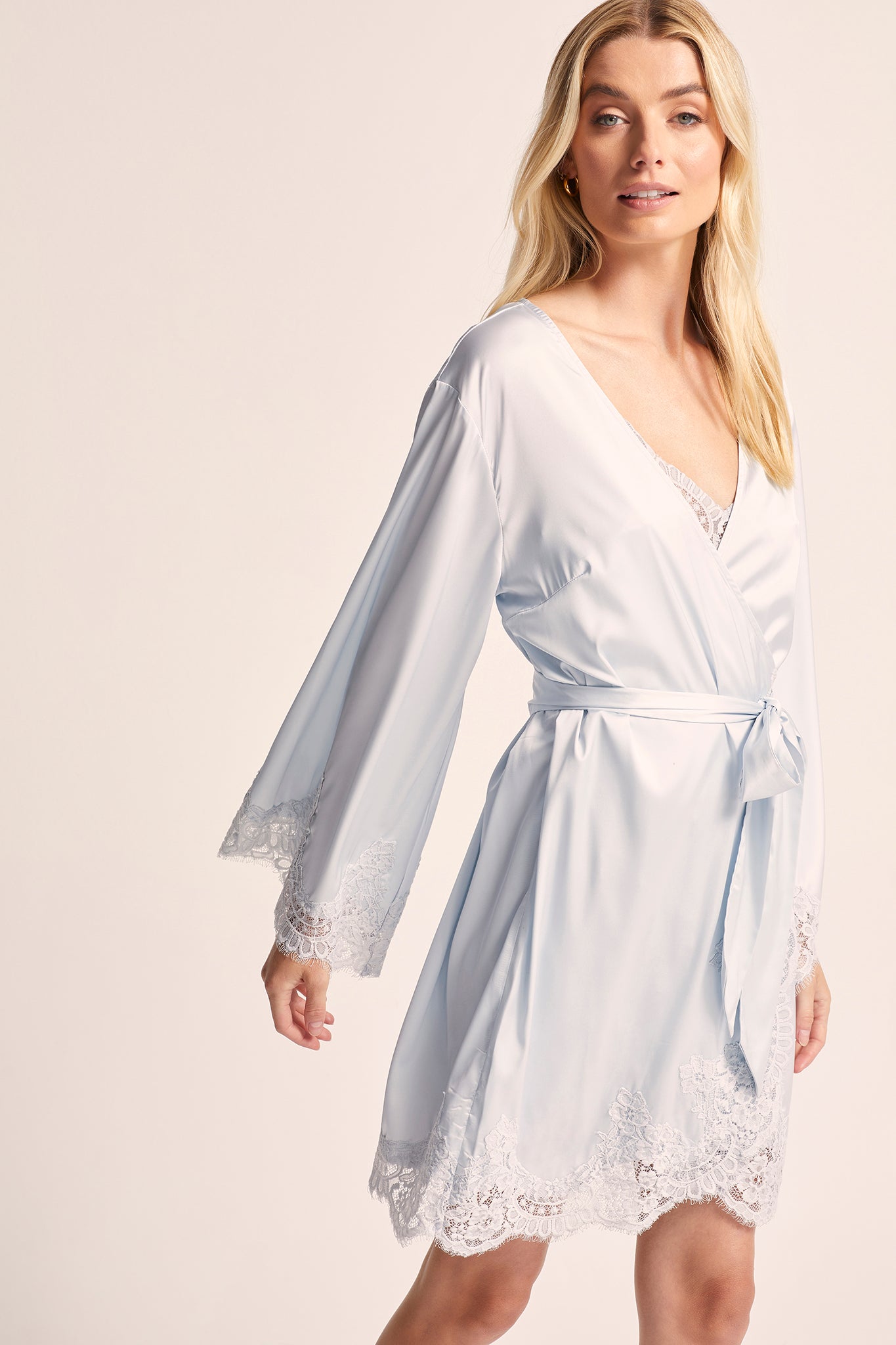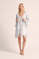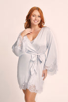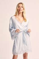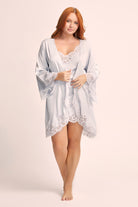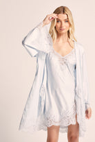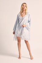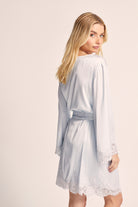 Indulge in the sheer elegance of our Sian Lace Robe in blue satin. This luxurious robe is crafted from soft satin and delicate lace, ensuring both comfort and glamour.