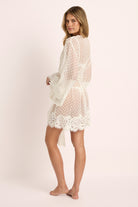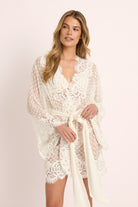The silhouette features flowing kimono-style sleeves and a soft satin waist sash that defines the figure while keeping an effortless sense of ease. Intricate lacework frames the neckline, cuffs, and hem, creating a gentle contrast against the airy dotted tulle. Designed in Australia, the Chloe Robe captures the essence of bridal luxury — understated yet unforgettable.