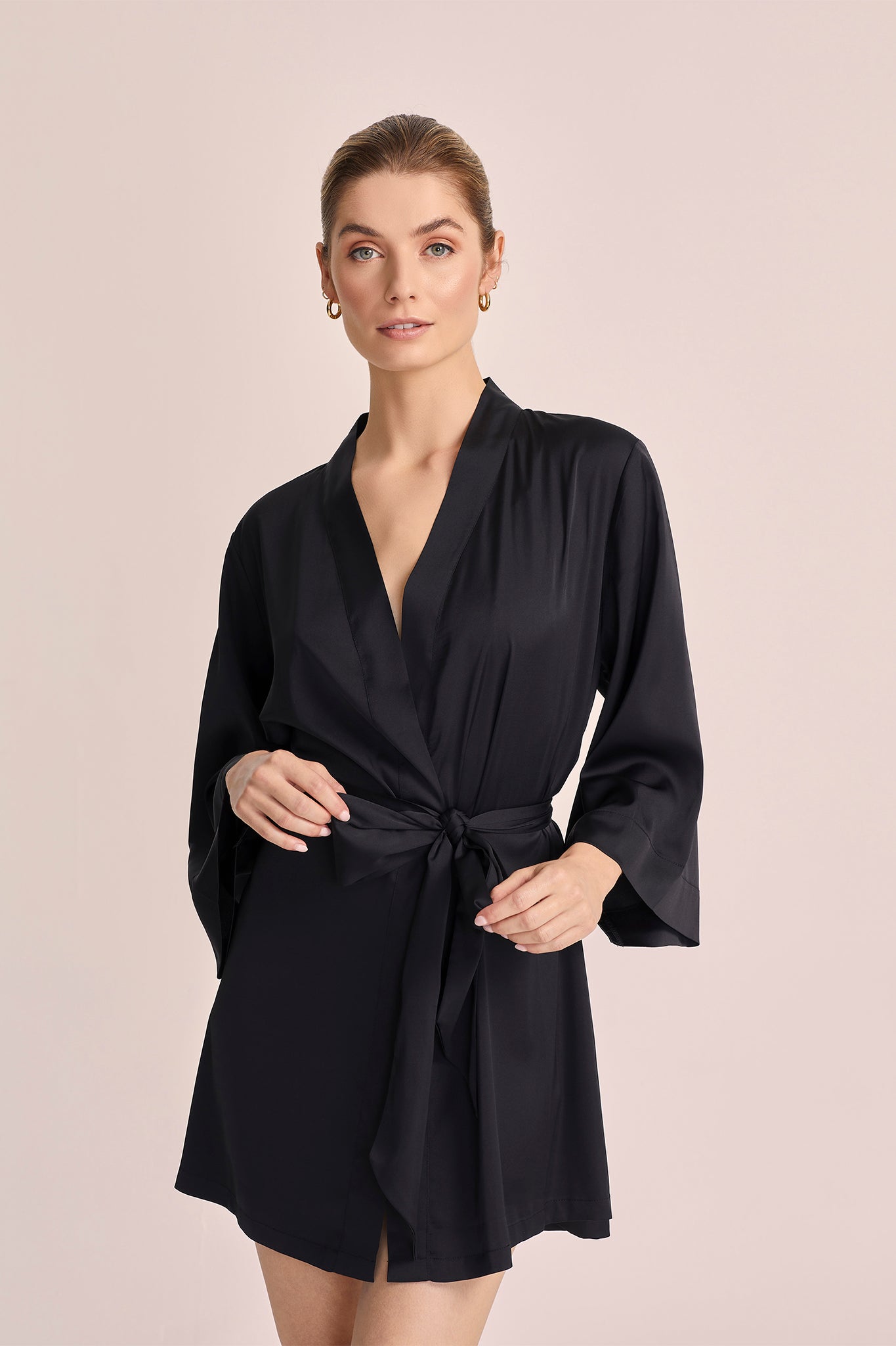 Boasting a sleek silhouette and timeless allure, The Evie Robe exudes sophistication with every wear. Wear it as a robe for cozy evenings at home, or layer it over the Minka Short Slip as a chic jacket for an effortlessly stylish look. For a coordinated ensemble, pair it with the Tahlia Lounge Pants and Leda Cami Set for the ultimate in elevated loungewear.