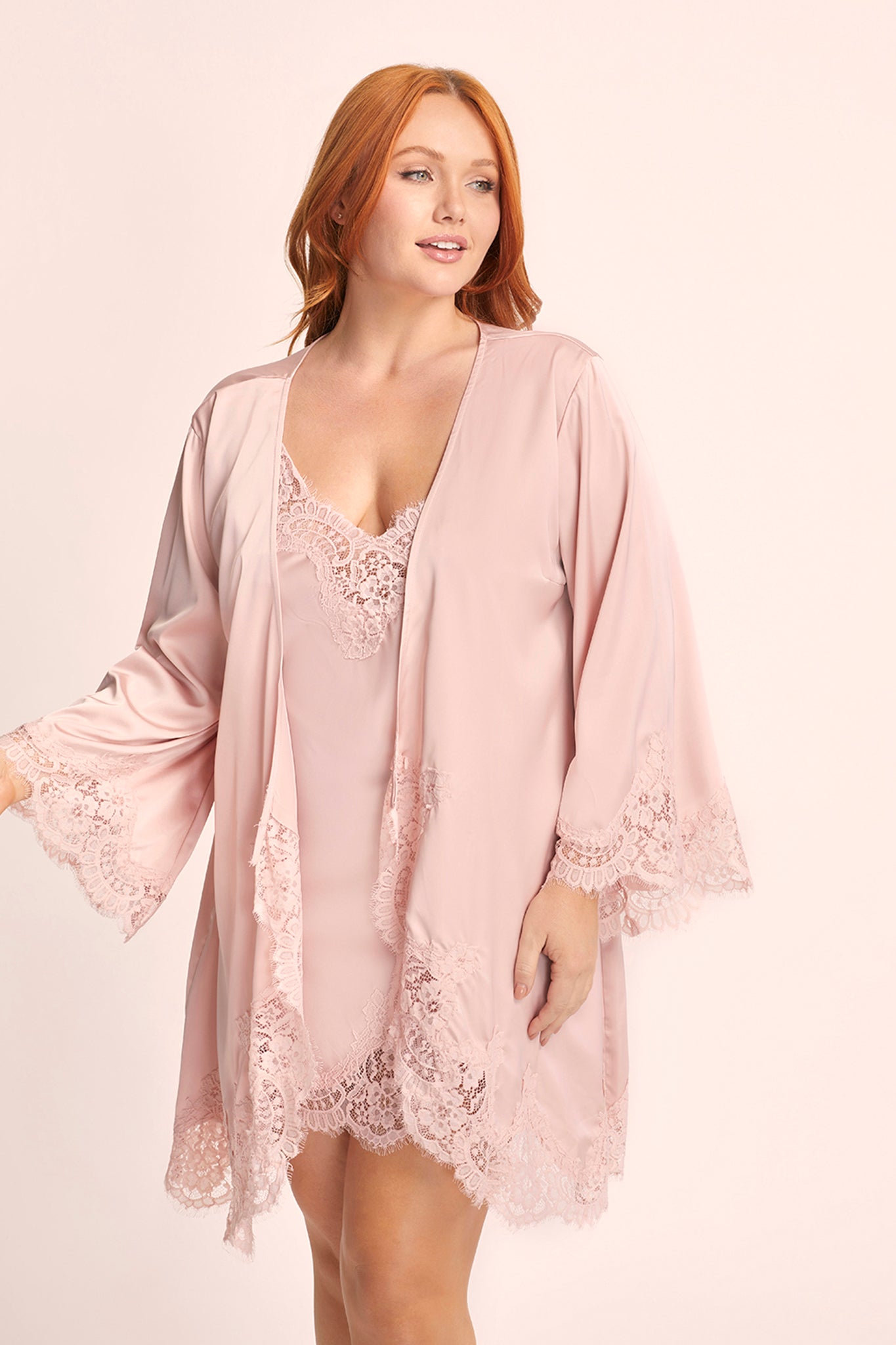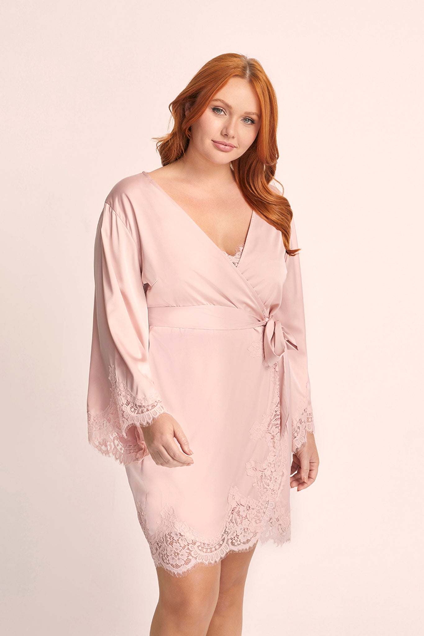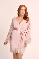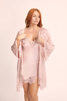 Introducing the Sian Lace Robe—an opulent and alluring piece designed to leave a lasting impression. Crafted from sumptuously soft satin and adorned with enchanting dusty rose cotton lace, this robe accentuates your curves with its waist tie and flattering silhouette.