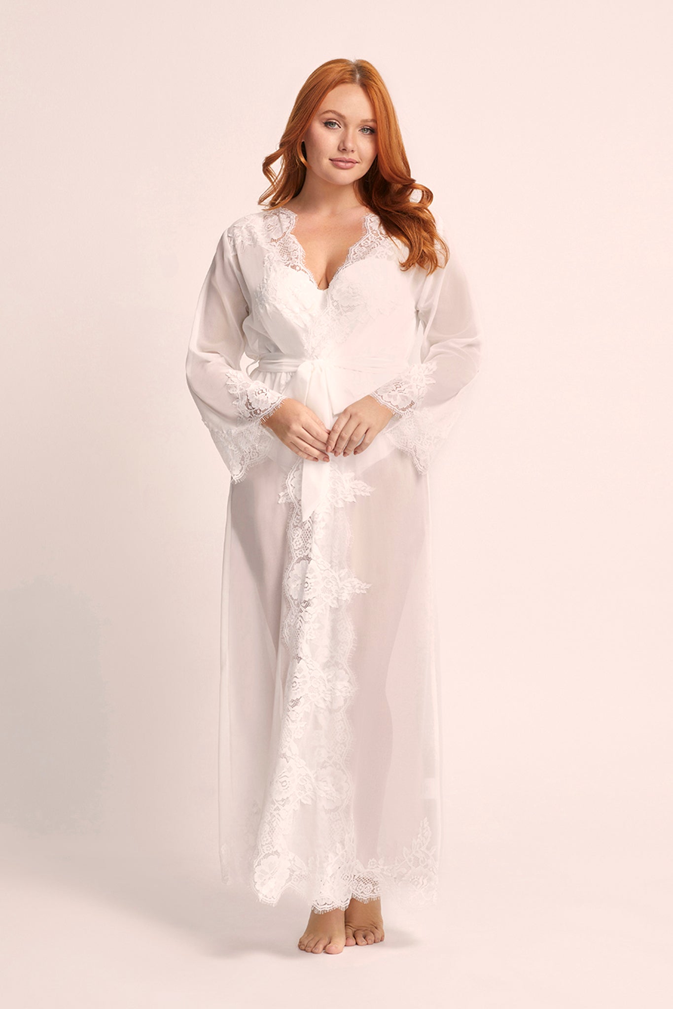 Crafted from semi-sheer white chiffon with our exclusive lace rosette trim, this best-selling bridal robe drapes beautifully and photographs like a dream. The floor-length design (144cm) creates an elegant silhouette that flatters every figure, while the sewn-in waist sash ensures the perfect fit. Whether you're getting ready with your bridesmaids, capturing those precious pre-ceremony moments, or enjoying your honeymoon, this robe envelops you in romantic elegance. Loved by brides worldwide for creating picture-perfect getting-ready moments.