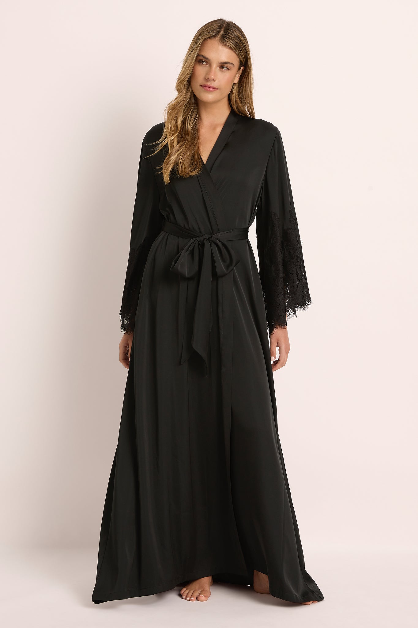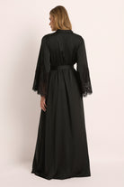 Exquisite lace detailing adorns the sleeves and hem, adding a touch of romance and refinement. With a flowing silhouette and a self-tie waist, this robe offers both comfort and a flattering fit, making it perfect for slow mornings, relaxing evenings, or layering over your favorite Homebodii pieces.