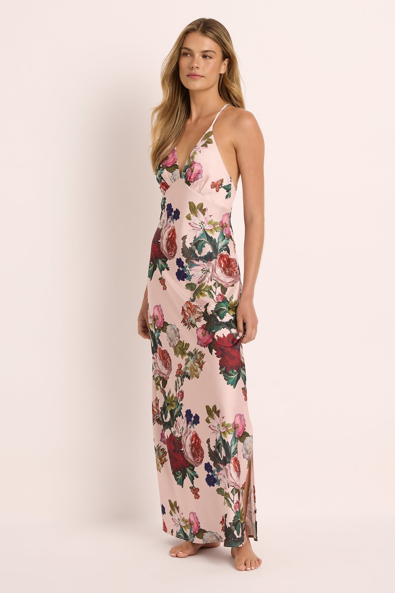 Its delicate blush floral print evokes garden mornings and golden-hour glow, while adjustable straps and a gently flared bias cut create an elegant, flattering silhouette. Perfect for bridal moments, self-care rituals, or simply feeling beautiful at home, the Aurora Maxi Slip embodies Homebodii’s signature harmony of luxury and comfort.