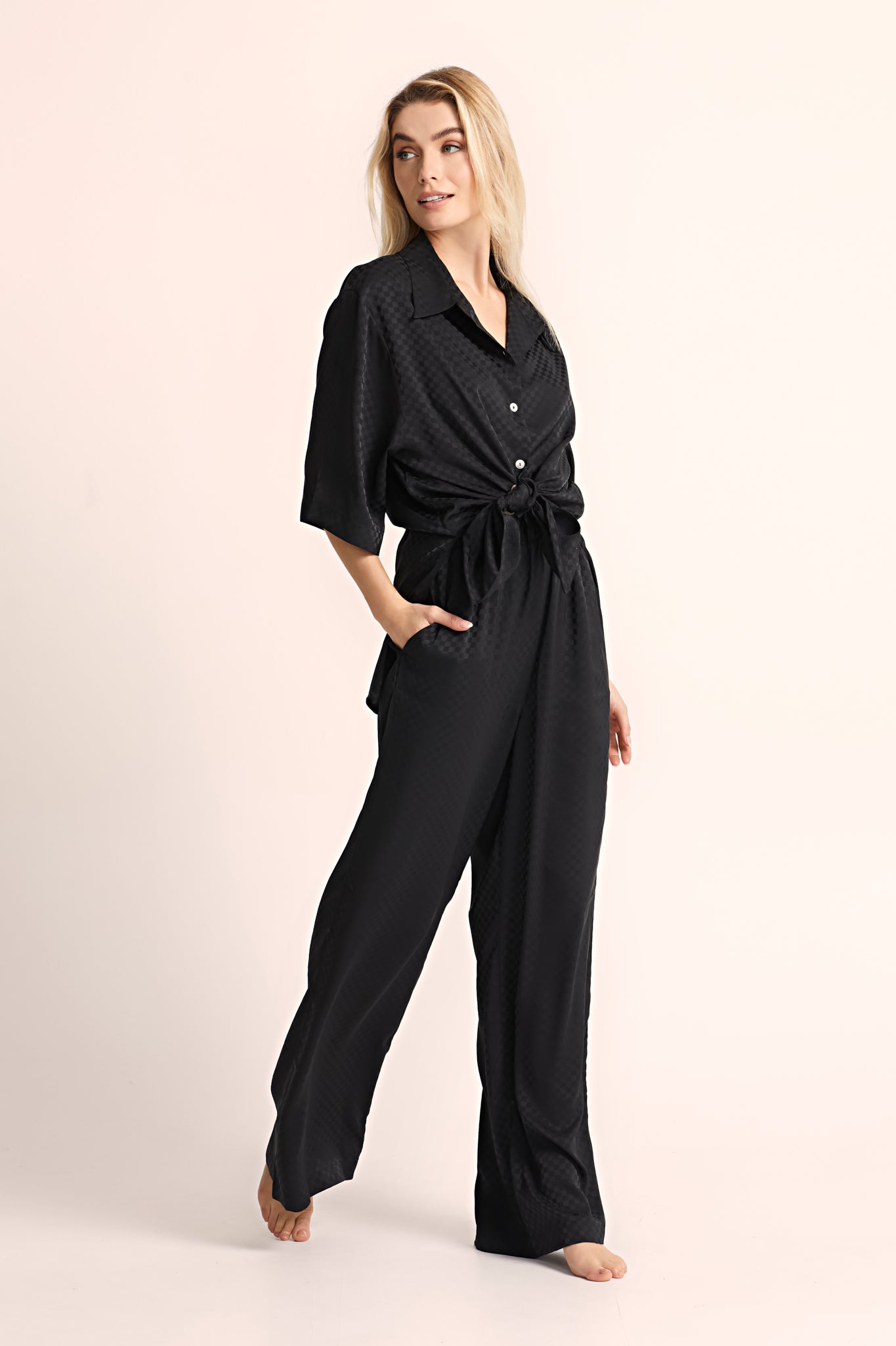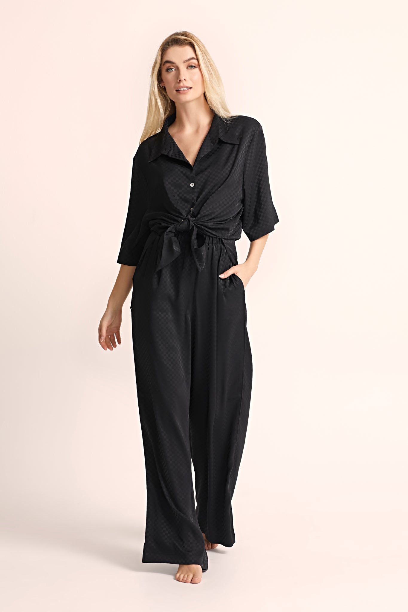 Elevate your loungewear experience with our Gigi Checked Satin Range, crafted from OEKO-TEX® certified satin, offers a luxurious feel while ensuring sustainability and safety, free from harmful substances—perfect for comfortable, eco-conscious elegance.