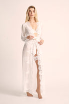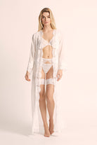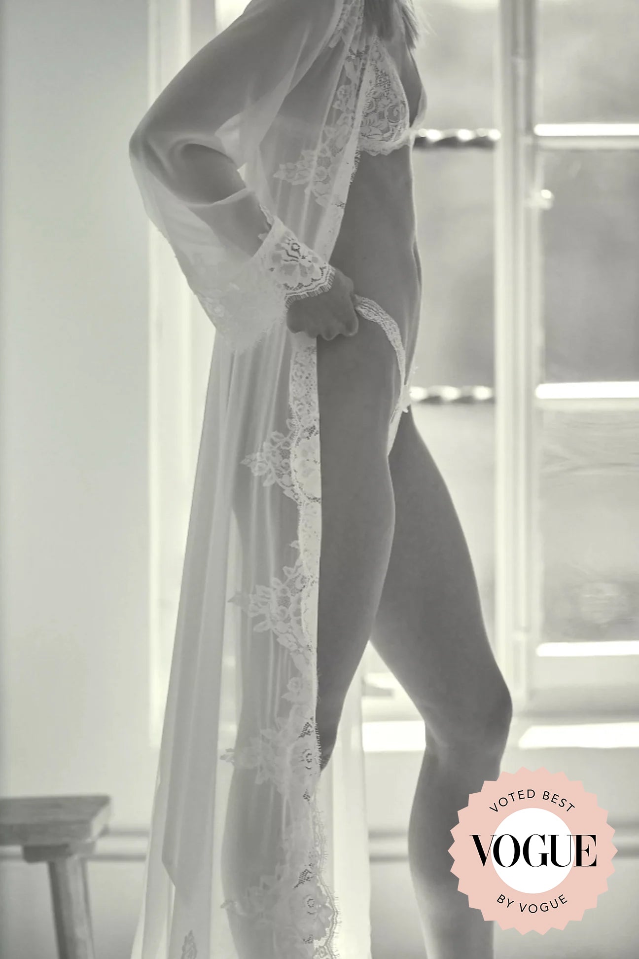 Our best-selling Helena Lace Robe embodies timeless elegance and modern romance. Crafted from semi-sheer white chiffon and adorned with intricate lace rosettes, this signature Homebodii design perfectly balances sophistication and allure.