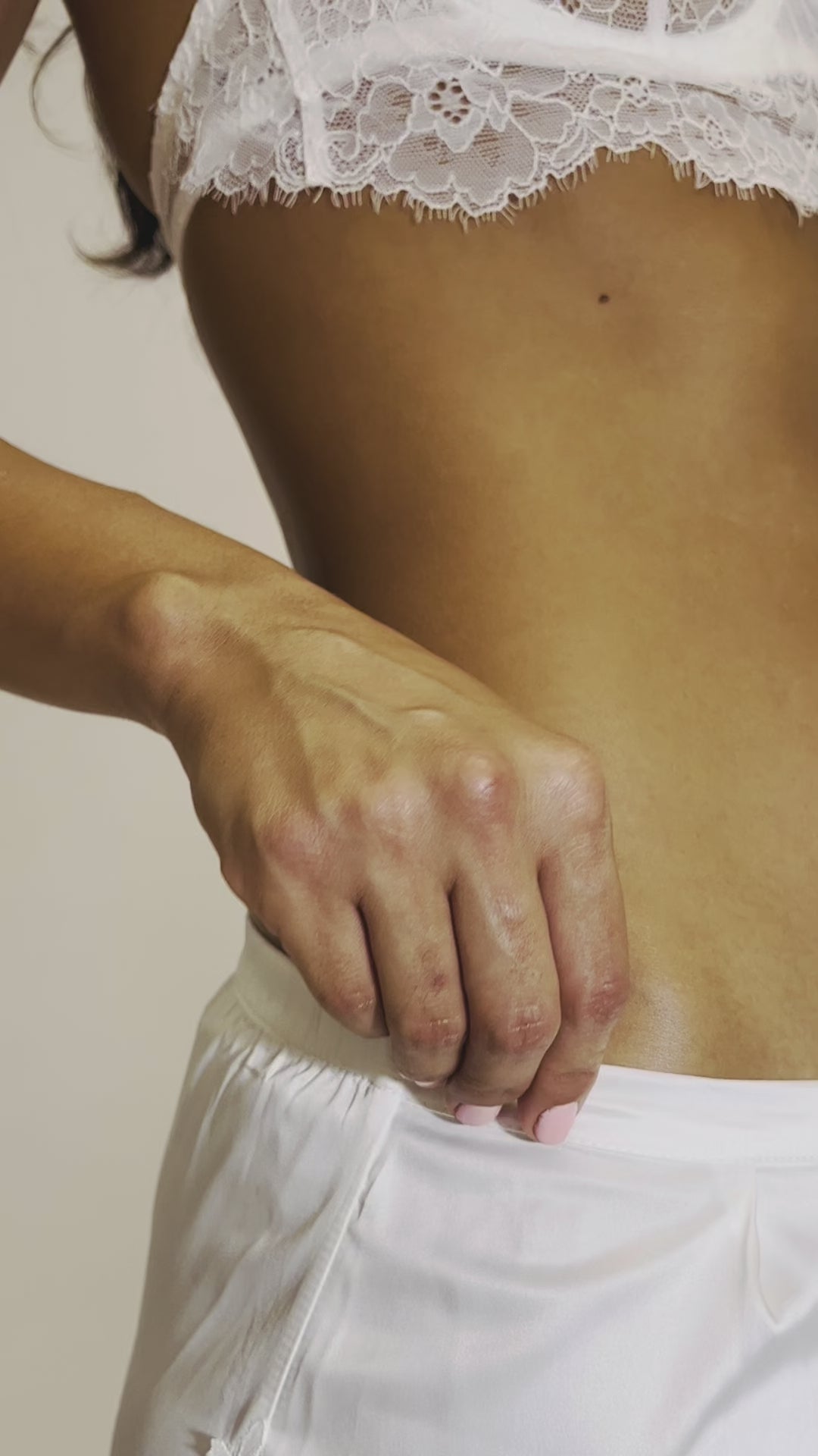 Made from semi-sheer white chiffon with exclusive Homebodii lace rosette trim