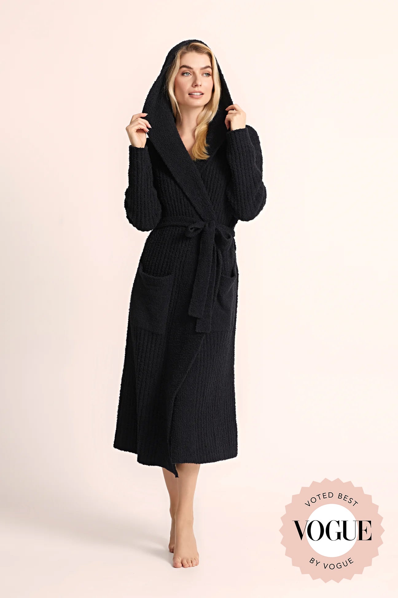 Searching for the perfect gift for him and her? Look no further! Our best-selling lush plush robe is now available in black. Crafted from the softest stretch plush material, Homebodii's Ultimate Luxe Robe is like being wrapped in a warm hug. With cuffed long sleeves, a self-tie belt, two patch pockets, and a hood for extra coziness, it's the ultimate way to stay snug this winter. Treat yourself or a loved one to the epitome of luxury with this exquisite robe from Homebodii.